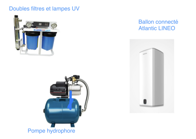 Autonomie en eau : une pompe avec un photophore aspire l’eau qui va passer par des filtres dont un au charbon actif avant et traverser une lampe UV qui finira de détruire virus et bactéries